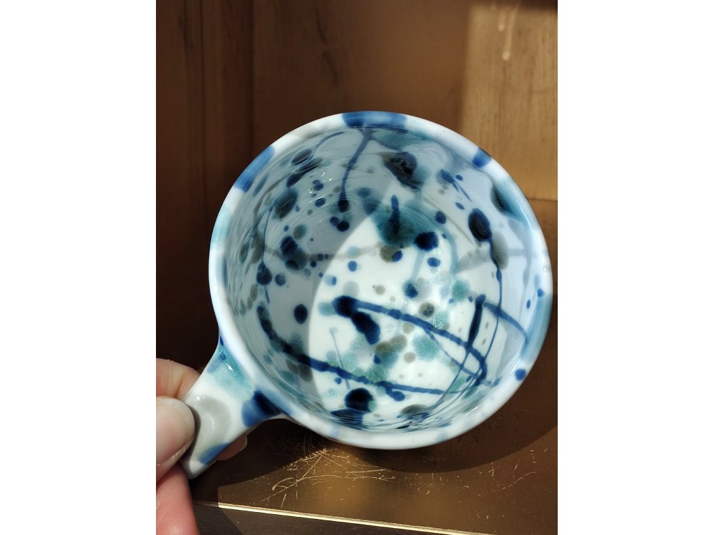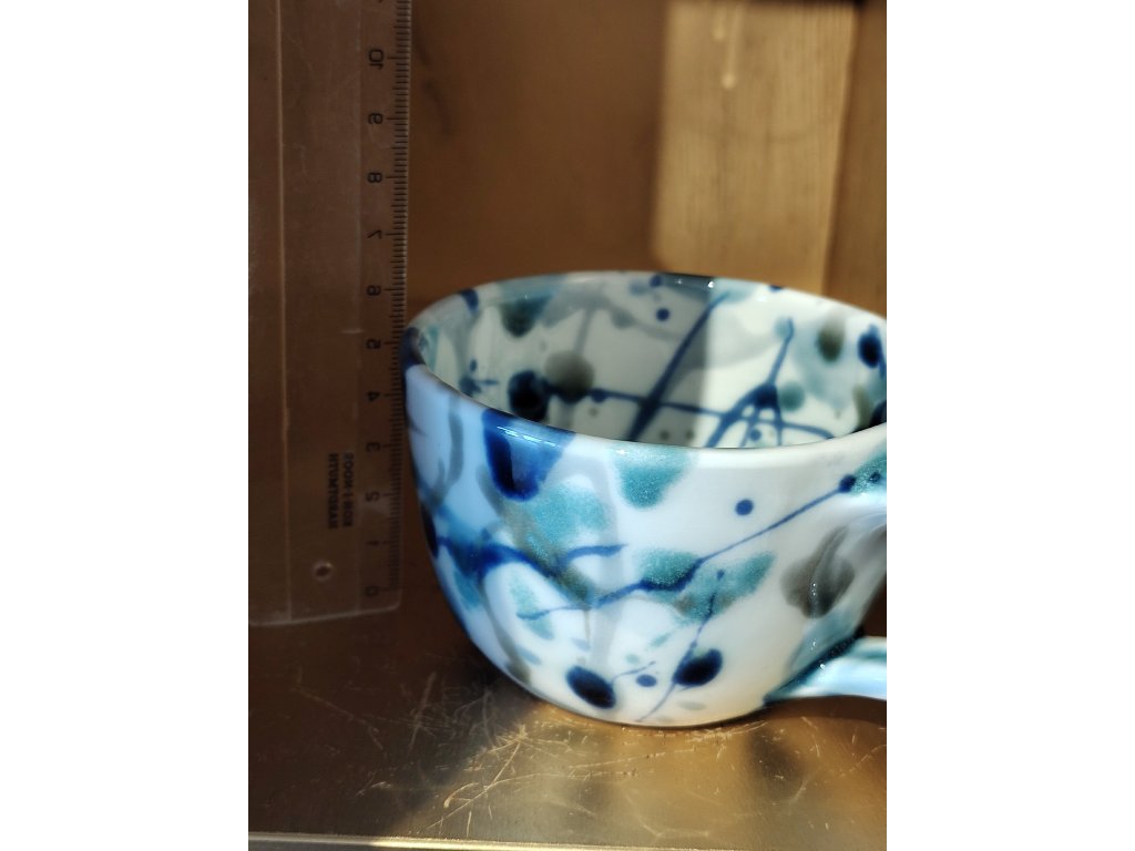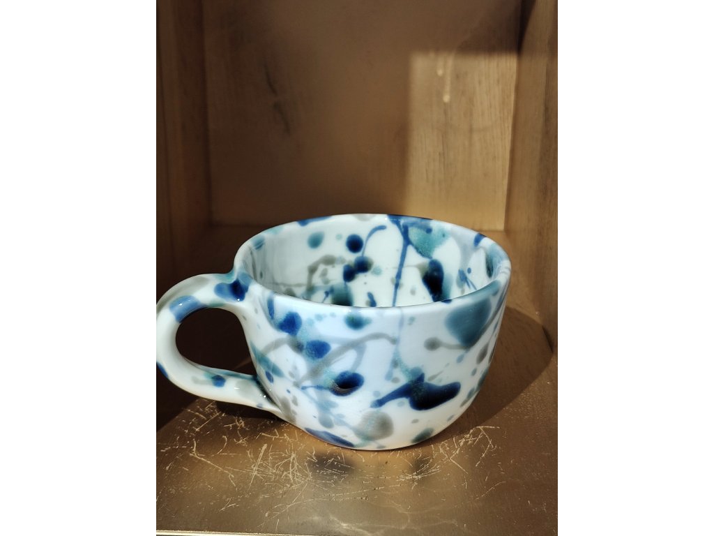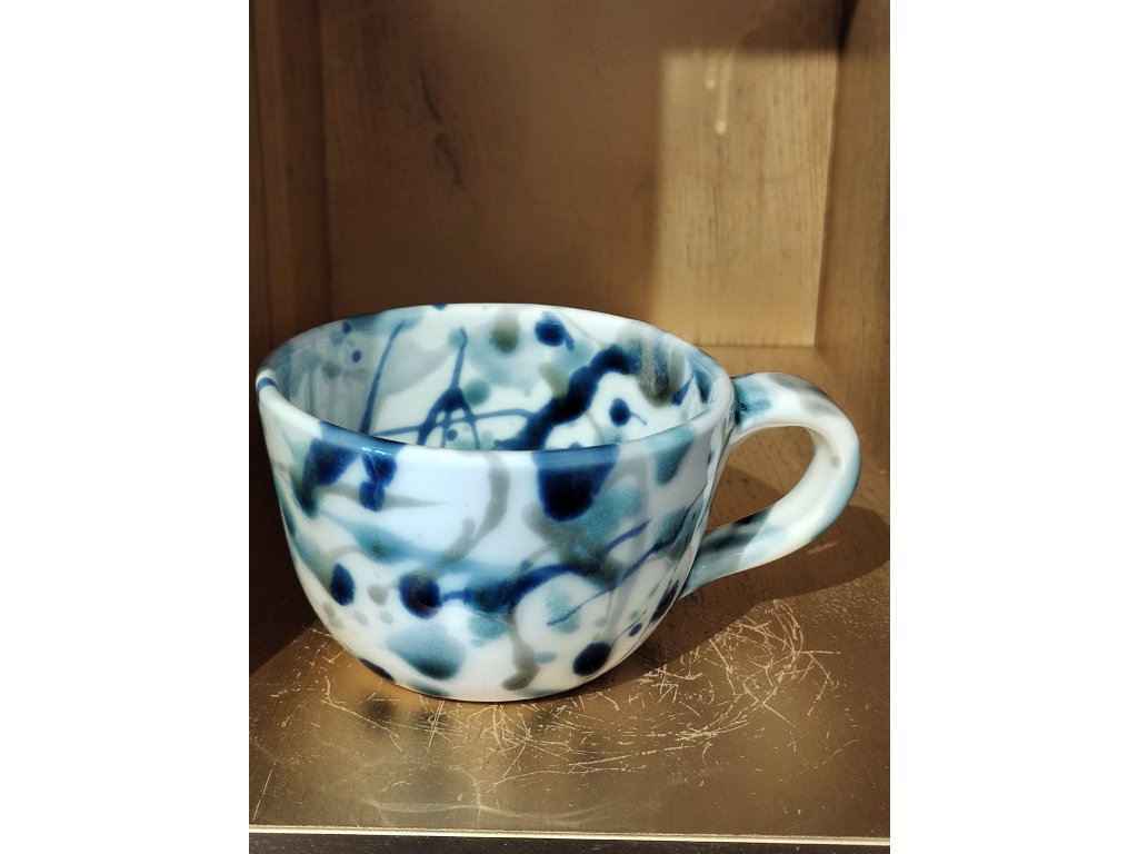 Hrnek z porcelánu, vesele cáknutý barvami na porcelán, modré a zelené tóny, barvy moře. Objem cca 2,5dcl, ručně točený, každý trochu jiný , 6 cm výška, cca 8cm průměr