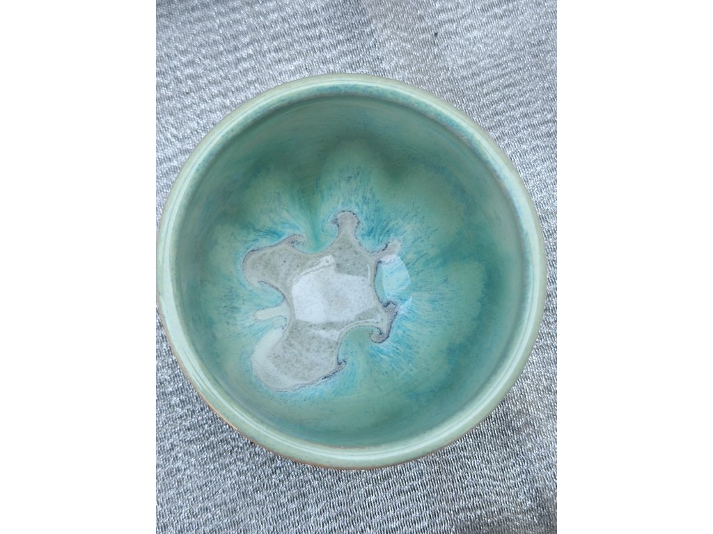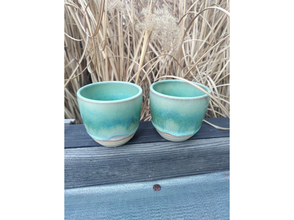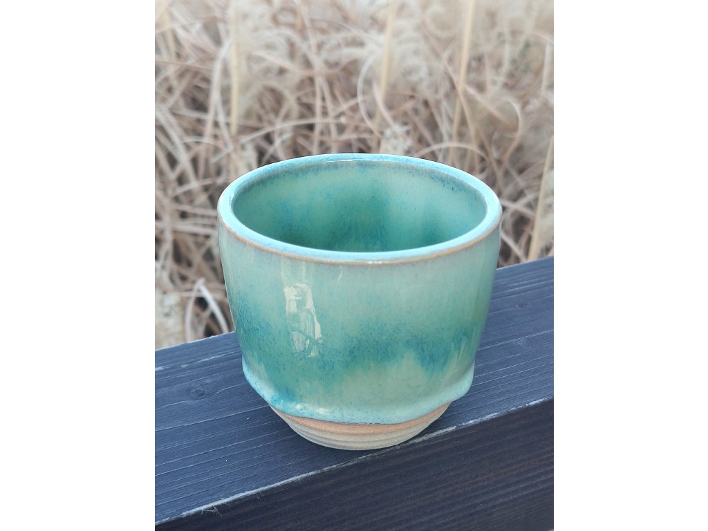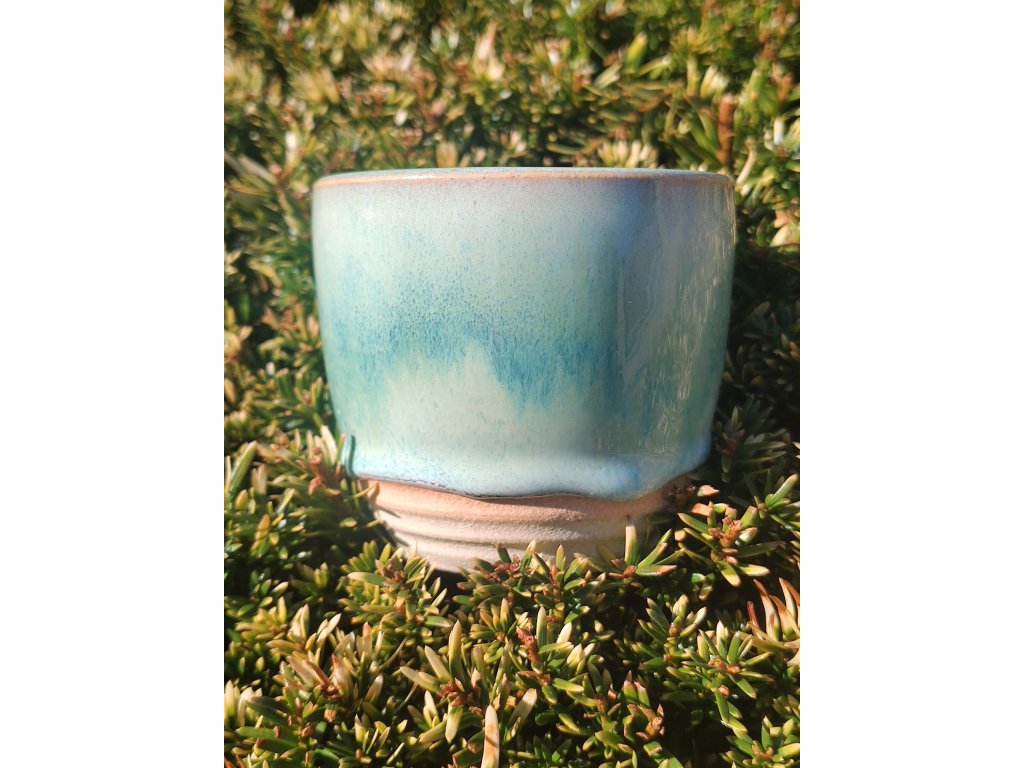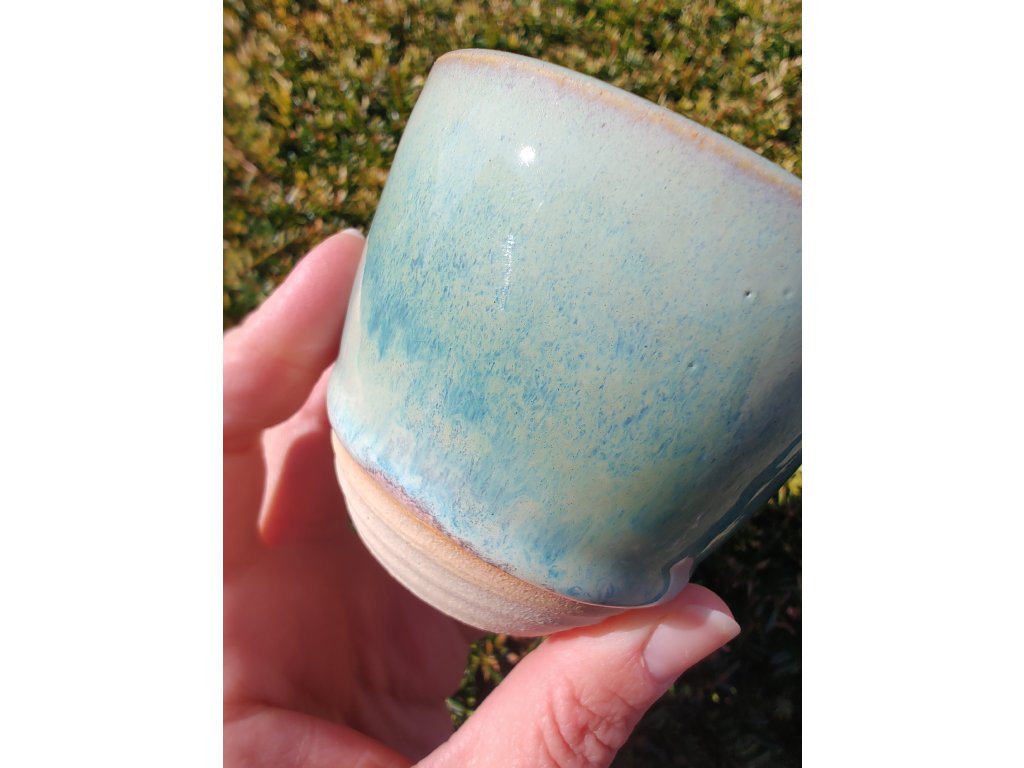 Do ruky příjemný keramický kalíšek s efektními glazurami, barvy zelené odstíny až místy šedé a do modra. Objem cca 1,5dcl, každý trochu jiný, na kruhu točený. Výška 6,5 cm, průměr 7 cm. Při spodním okraji glazování tekoucí vlnky.